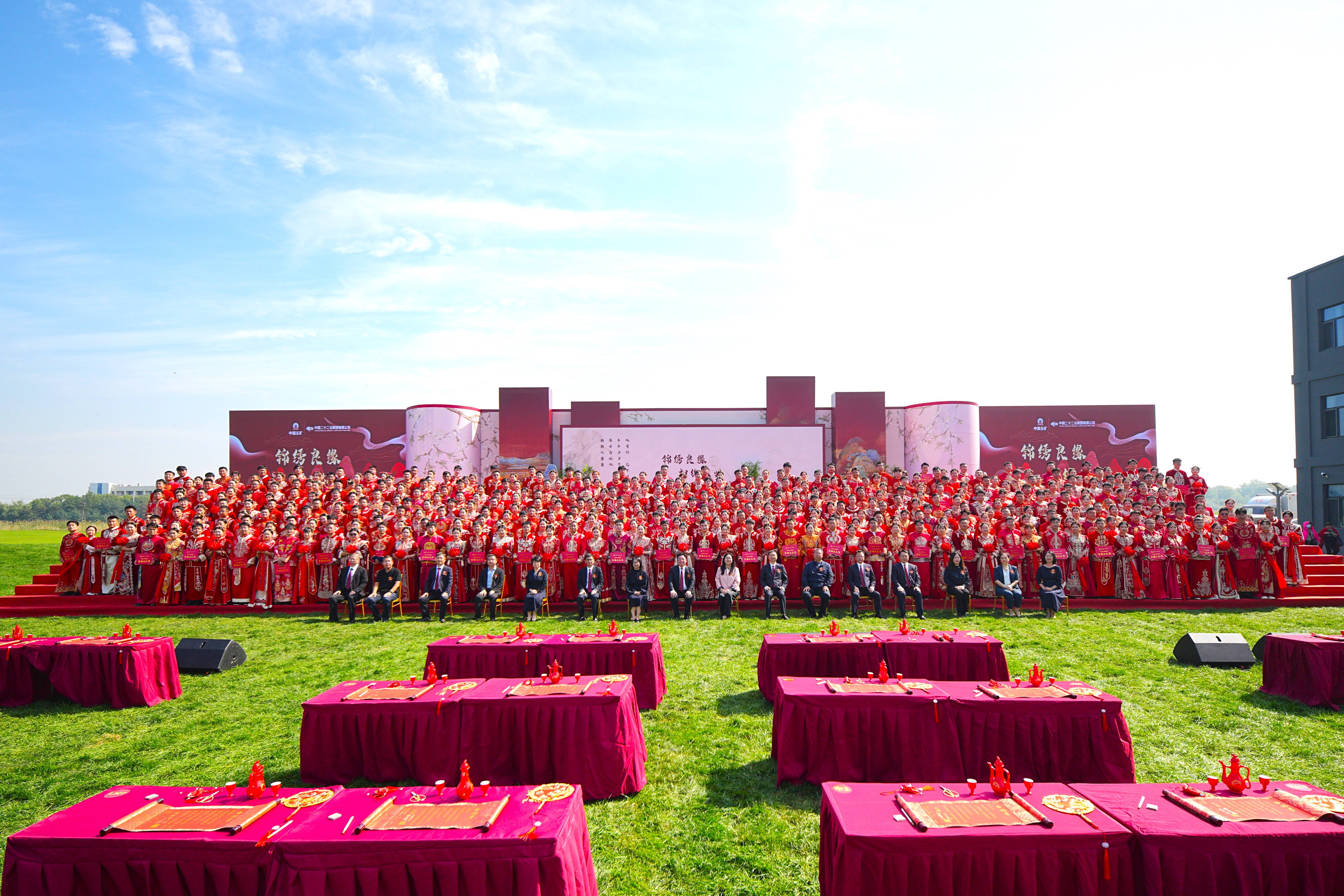 吉时已到,华灯初上。至亲挚友欢聚一堂,共贺新禧,同证鸳盟。203对新人执红绸相牵,踏锦毯徐行。新娘凤冠流彩,团扇半掩芙蓉面;新郎红袍玉带,眉宇尽展英气。八方宾客共睹此天作之合,百对新人同缔山海之盟,满座皆沐华夏婚仪之雅韵,共仰千年礼乐之风华。